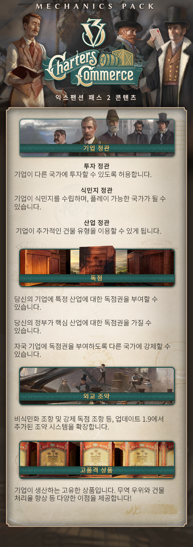 Victoria 3의 신규 Mechanics Pack Charters of Commerce에서 금융과 무역 체제를 구축해 국가를 부유하게 만들고 경쟁자를 압도하십시오. Charters of Commerce는 Victoria의 정교한 무역 모델에 깊이를 더하며 새로운 선택지를 소개합니다. 여기에는 기업 확장을 규제하는 새로운 방법, 새로운 외교적 도구를 포함해 국가의 명성을 높여 줄 독특하고 다양한 신규 상품까지 포함되어 있습니다.