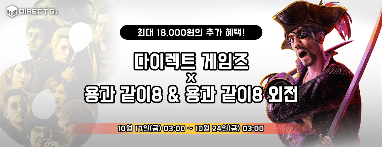 • 이벤트 내용: 이벤트 기간 내 다이렉트 게임즈에서 <용과 같이8> & <용과 같이8 외전 파이리츠 인 하와이> 모두 구매 시 다이렉트 게임즈 포인트 지급 (계정당 1회)