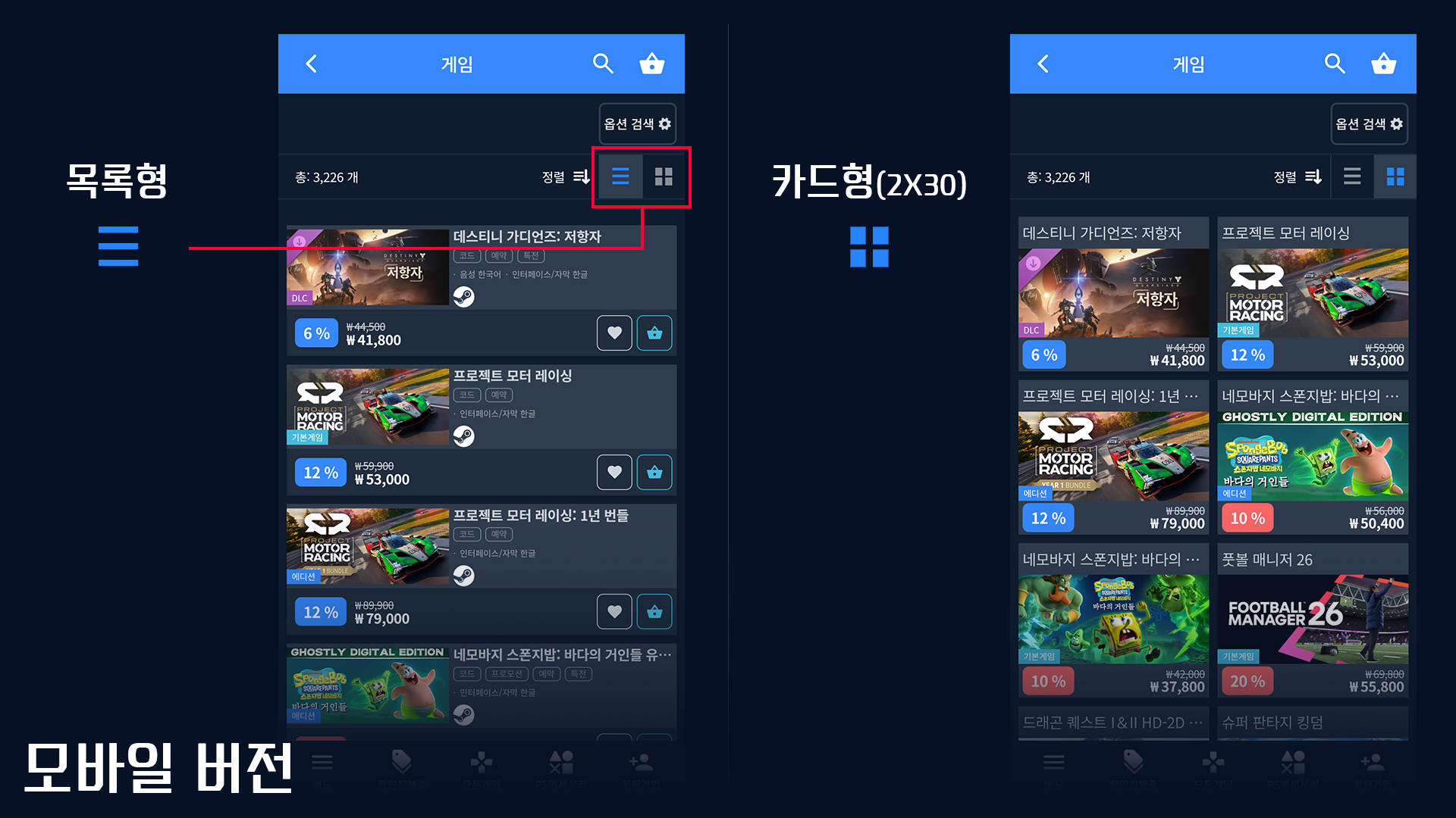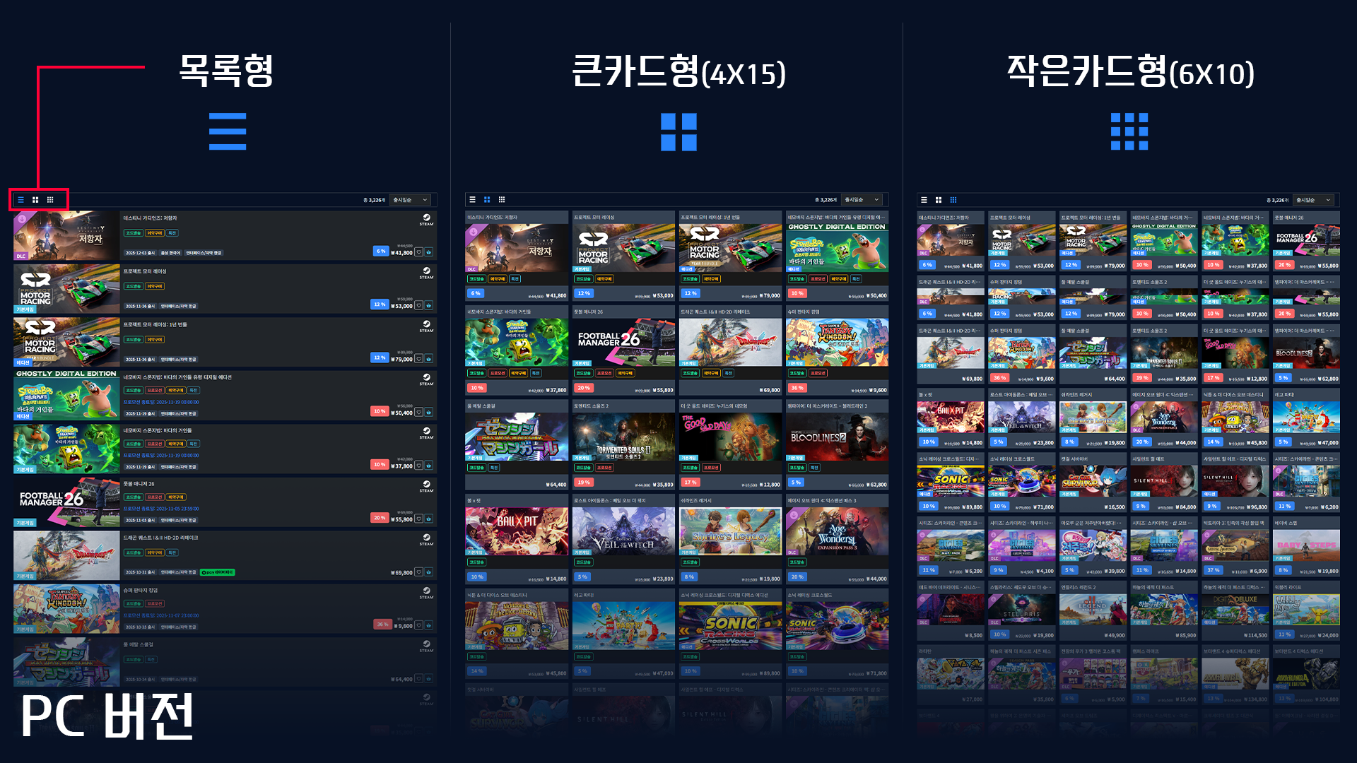 2. 상품 배열 개선: 상품 목록의 기본 배열을 큰 카드형으로 업데이트, 목록형 및 작은카드형까지 총 3개의 형식 지원