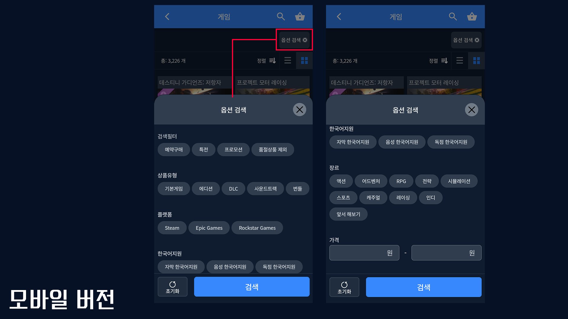 3. 검색필터 기능 개선: 품절상품 제외, 유형 선택, 가격대 설정 등의 기능 추가 및 개선