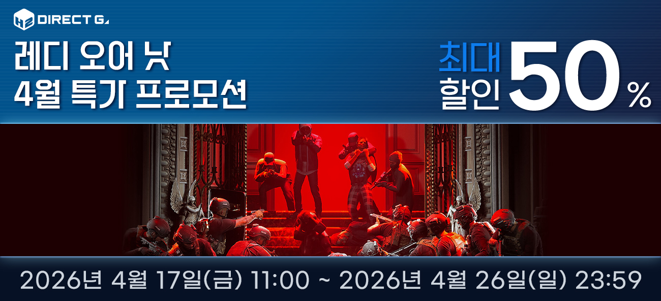 레디 오어 낫 4월 특가 프로모션 안내 2026-04-17 11:00:00 by 다이렉트 게임즈 안녕하세요, 다이렉트 게임즈입니다. 레디 오어 낫 4월 특가 프로모션 안내 말씀드립니다. ■ 레디 오어 낫 4월 특가 프로모션 • 내용: <레디 오어 낫> 등 할인 판매 • 기간: 4월 17일(금) 11:00 ~ 4월 26일(일) 23:59까지 ※ 프로모션 기간과 할인율, 품목은 사정에 따라 사전 공지 없이 변경될 수 있습니다. 회원 여러분의 많은 관심 부탁드립니다. 감사합니다.