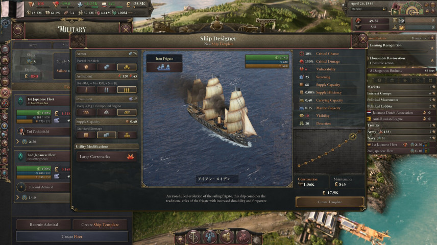 • 함선 설계: 국가의 전략적 필요에 따라 함대를 설계하고 건조하세요. 다른 국가에 영향력을 행사하기 위해 강력하지만 고가의 대양 횡단 전함을, 또는 연해를 수호하도록 설계된 효율적인 함대를 건조할 수 있습니다.