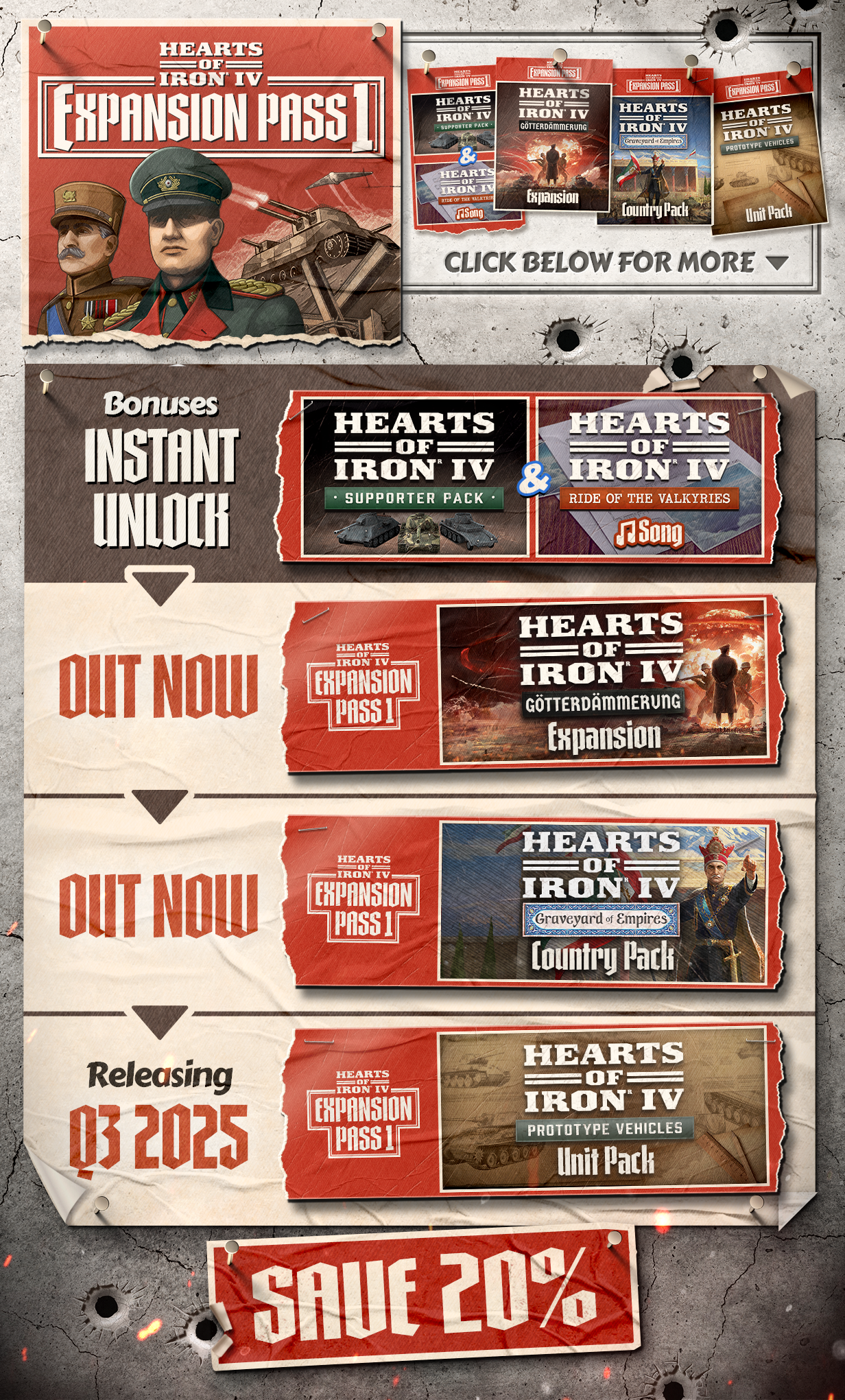 Expansion Pass 보너스 2종, 확장팩 1종, 국가 팩 1종 그리고 유닛 팩 1종을 포함하는 Hearts of Iron IV Expansion Pass입니다. 팩의 콘텐츠를 통해 대거 재구성된 포커스 트리로 독일의 새 역사를 써 내려갈 수 있고, 위험에 처한 아시아의 약소국으로 생존을 도모할 수 있으며, 새로운 차량 아트로 게임을 꾸밀 수도 있습니다.