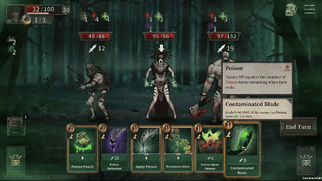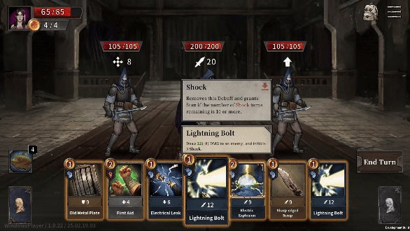 전투가 시작되면 카드를 이용한 턴제 전투가 시작됩니다. 스킬과 카드를 이용해 적을 공격하고 방어하며 전략적인 전투를 할 수 있습니다